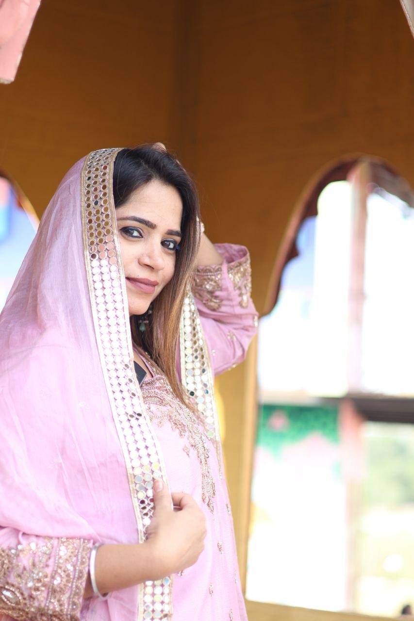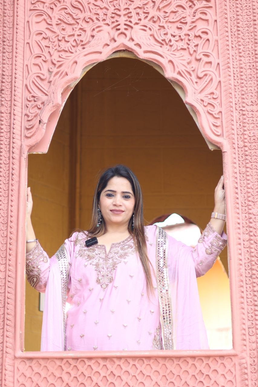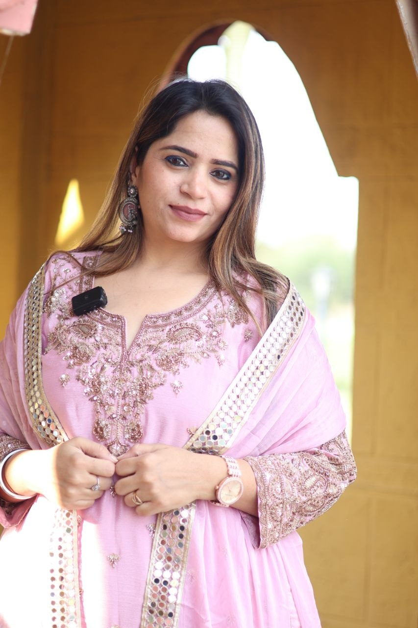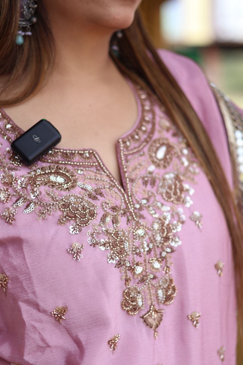 Gracefully elegant and perfect for festive occasions, this beautiful chinnon material blush pink suit set features intricate golden embroidery that adds a touch of timeless charm.