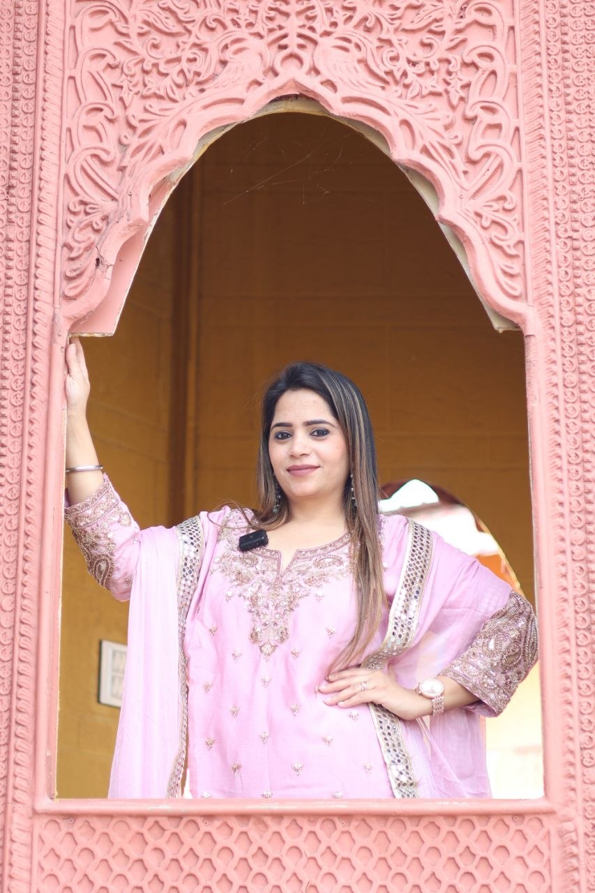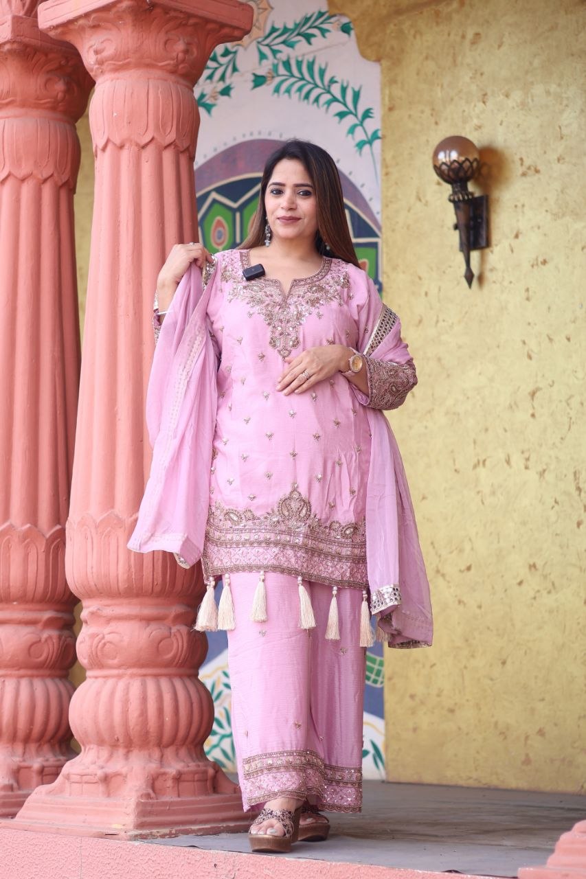 Gracefully elegant and perfect for festive occasions, this beautiful chinnon material blush pink suit set features intricate golden embroidery that adds a touch of timeless charm. The kurta is designed with delicate handwork on the neckline, sleeves, and hemline, complemented by stylish tassel detailing that enhances its traditional appeal. Paired with matching straight pants and a soft dupatta, this outfit offers both comfort and sophistication—ideal for celebrations, family gatherings, and special events.