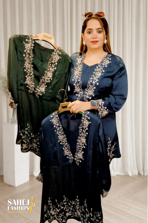 The dress is styled with a softly shaped neckline and gently flared sleeves, offering a balanced blend of structure and ease. Paired alongside is a complementary deep forest-green version of the same design, showcasing identical silver embroidery that highlights the versatility of the silhouette across rich jewel tones. The overall look feels understated yet opulent—perfect for evening gatherings, festive occasions, or elegant celebrations where subtle craftsmanship takes center stage.