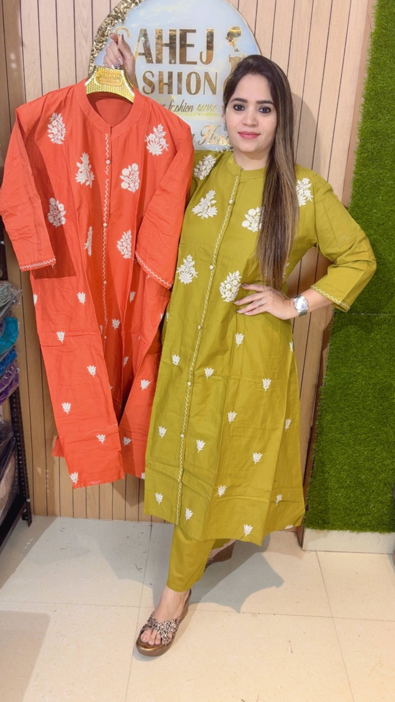 Bright, fresh, and effortlessly stylish—this pure cotton with embroidery kurta set is a perfect blend of comfort and charm. Vibrant mustard green kurta crafted from soft, breathable fabric, making it ideal for everyday elegance. The kurta features delicate white floral motifs spread gracefully across the fabric, paired with a neat front button placket and a smart band collar that adds a modern touch. The three-quarter sleeves with subtle detailing enhance its refined look.It is paired with matching straight pants, creating a coordinated and flattering silhouette that suits both casual outings and semi-formal occasions. The minimal yet eye-catching embroidery keeps the outfit light and versatile.For a pop of contrast, she also showcases an alternate option in a lively orange shade, adorned with similar white floral motifs and detailing—perfect for those who love bold and cheerful tones.Styled with simple footwear and minimal accessories, this outfit is your go-to choice for a chic, everyday ethnic look with a hint of sophistication.