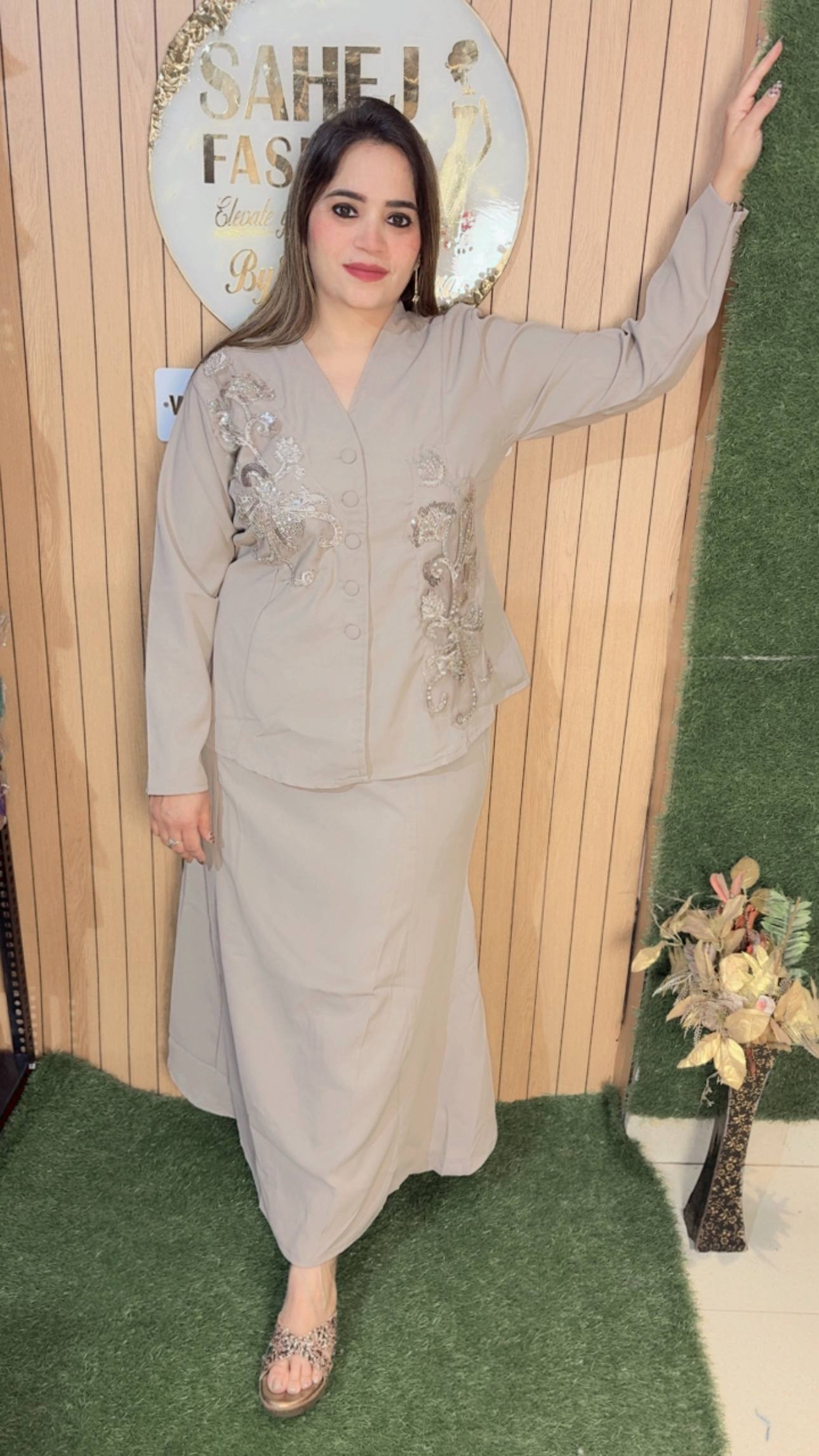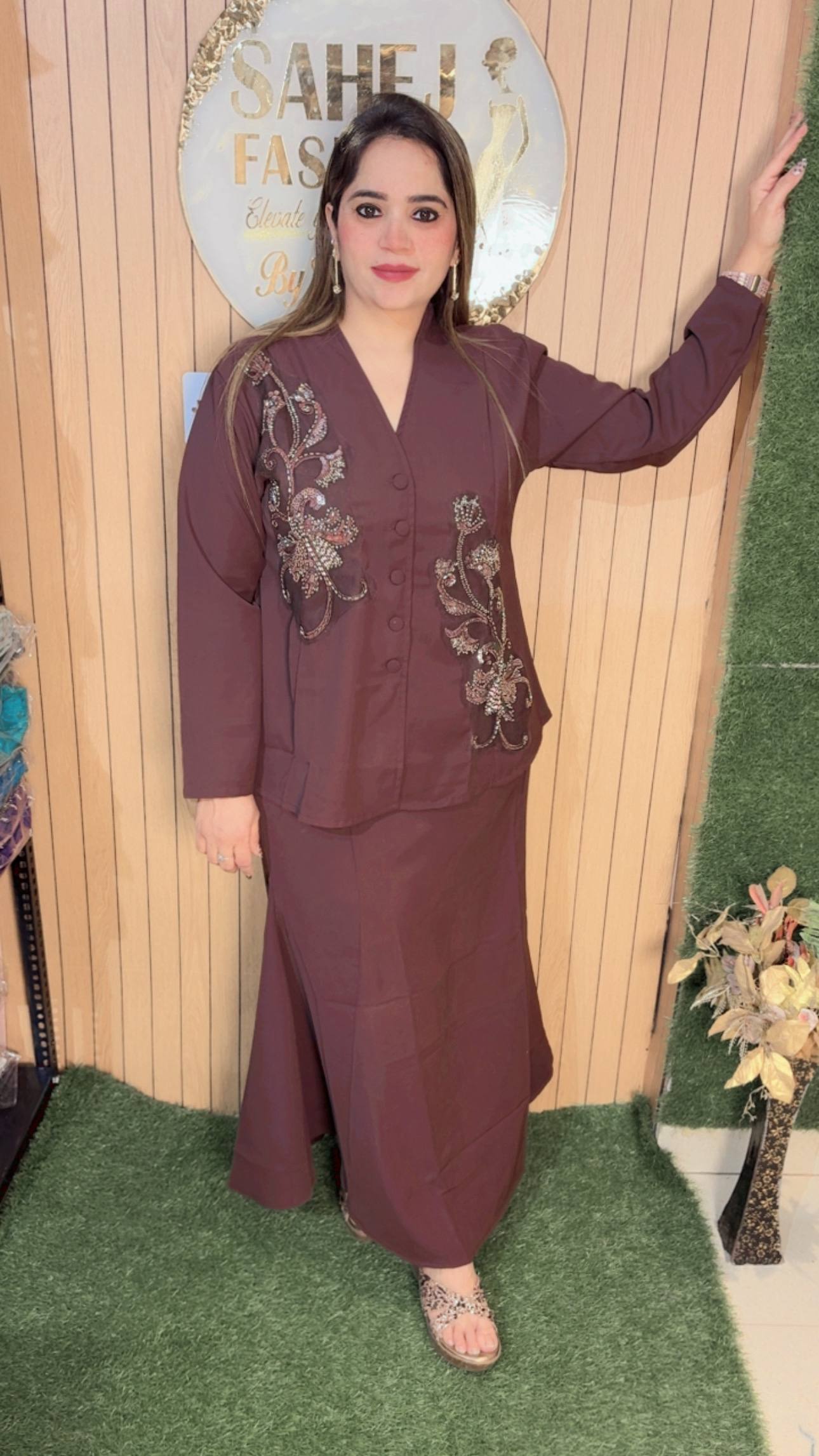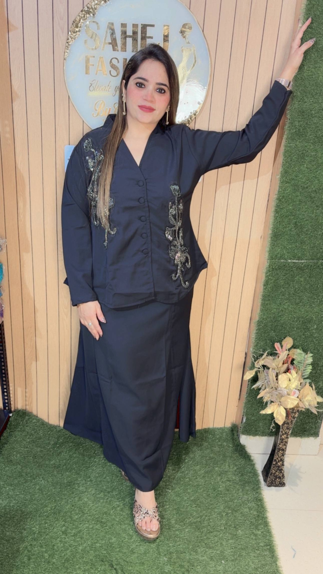 This outfit features a classy and contemporary ensemble that blends elegance with subtle detailing. The top is designed in a smart, structured silhouette with a V-neckline and front button closure, giving it a polished and sophisticated look. The highlight of the piece is the intricate metallic embroidery on both sides, adding a touch of shimmer and artistic flair without overpowering the simplicity of the outfit. The full sleeves enhance its refined appeal, making it suitable for both casual chic and semi-formal occasions.Paired with it is a long, flowy black skirt that falls gracefully, offering comfort along with a sleek, elongated look. The minimalistic design of the skirt perfectly balances the embellished top, creating a harmonious outfit.Styled with subtle accessories and embellished flats, this look is perfect for modern women who love understated elegance with a hint of glam.