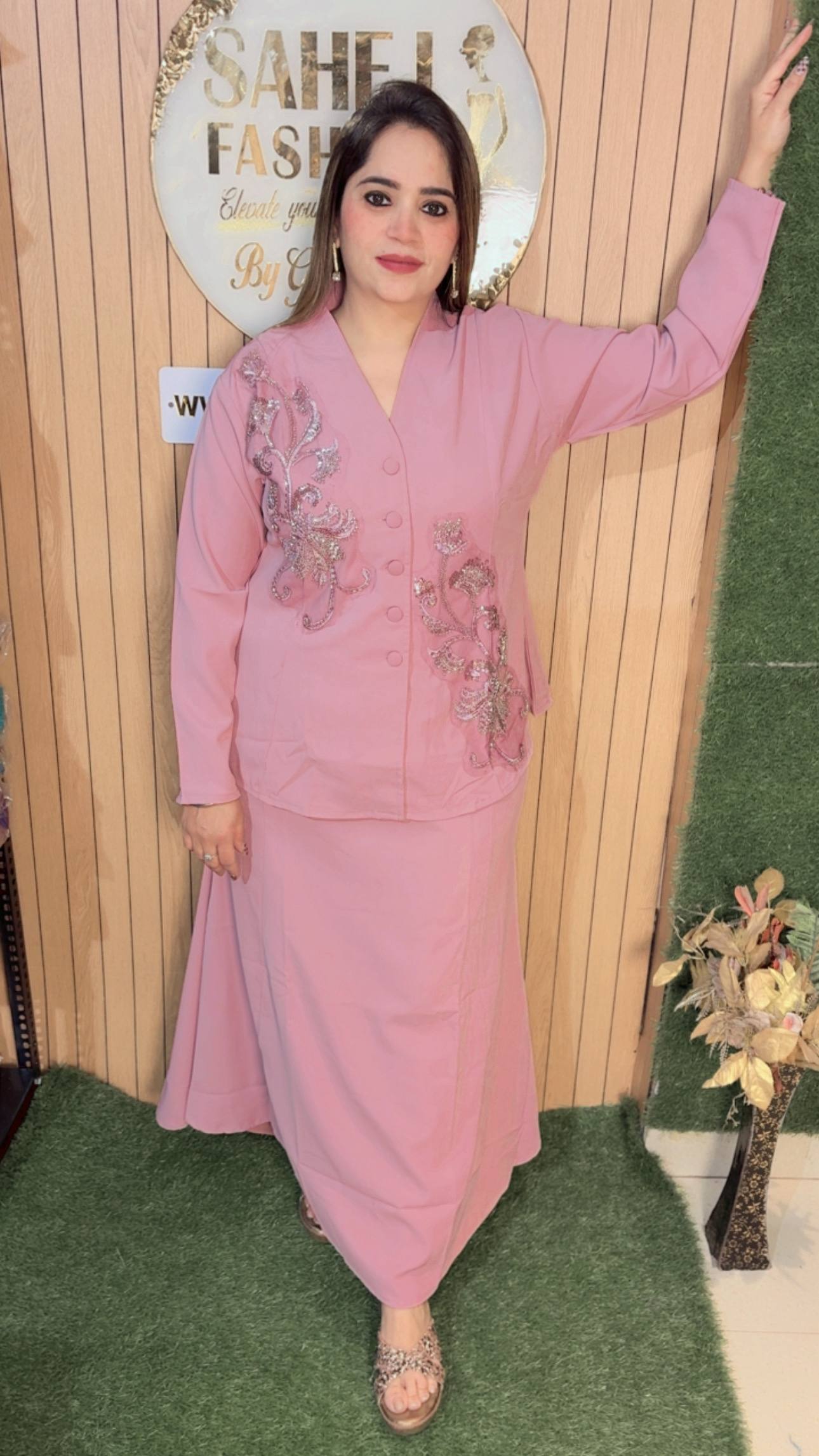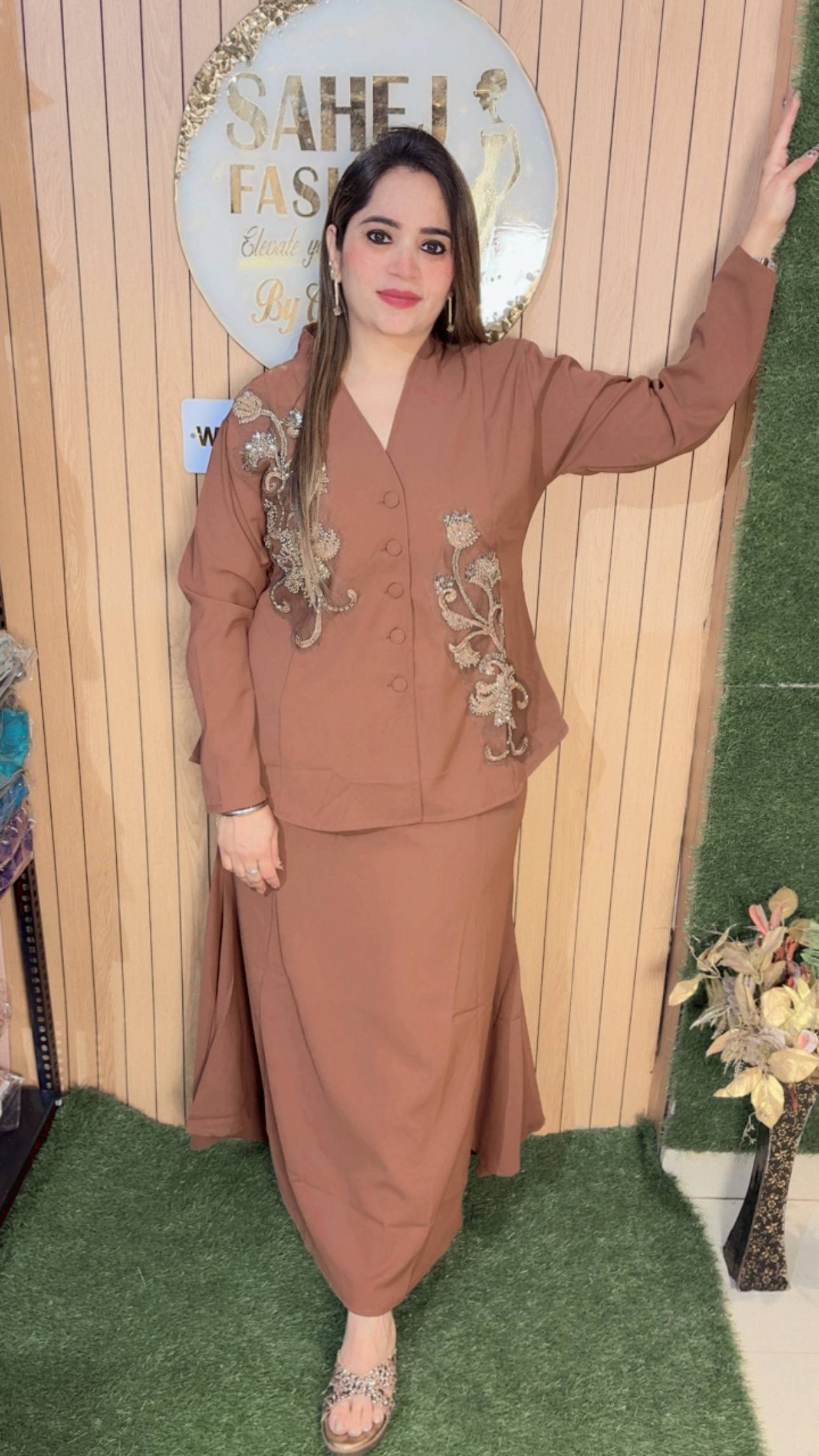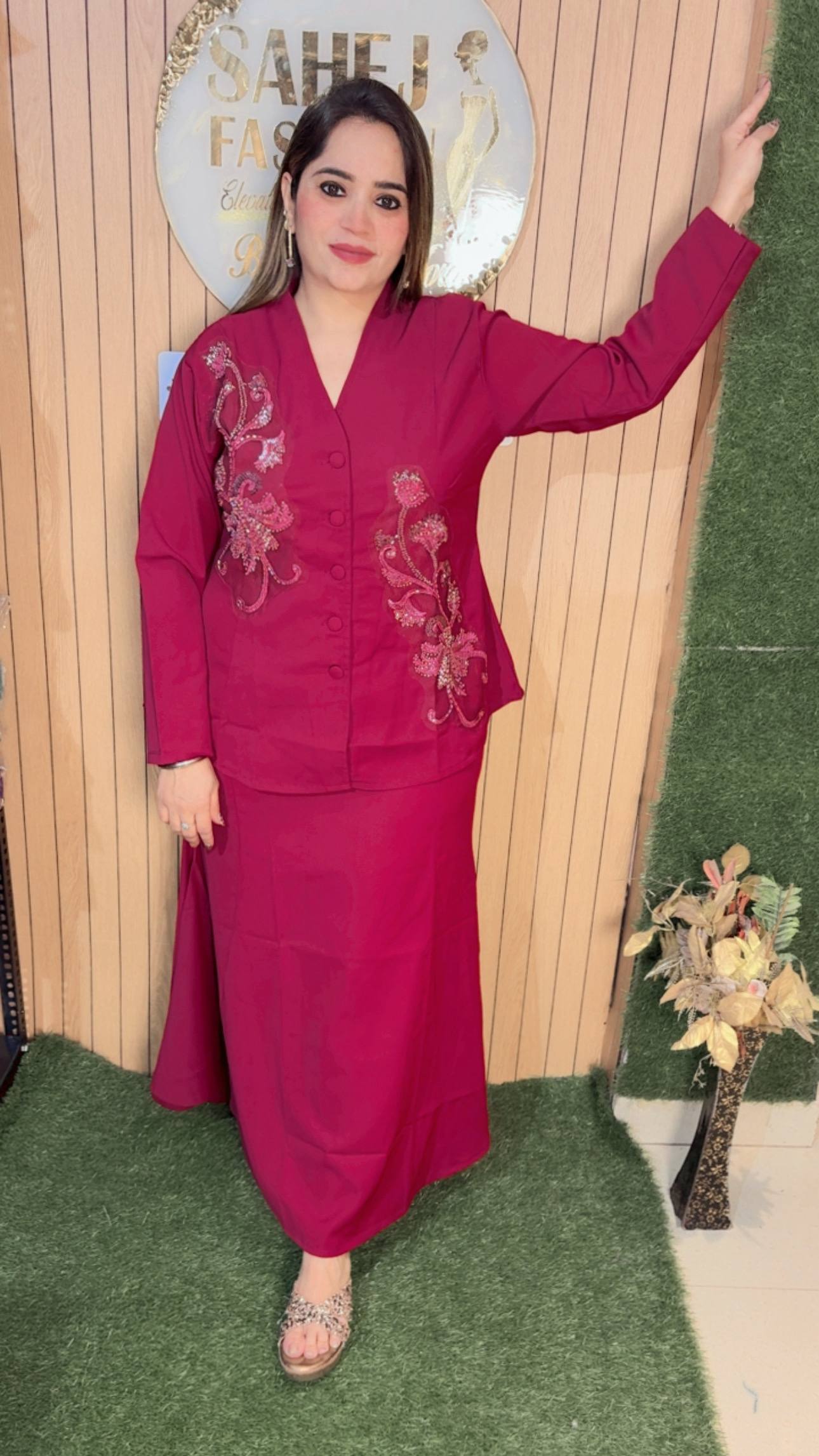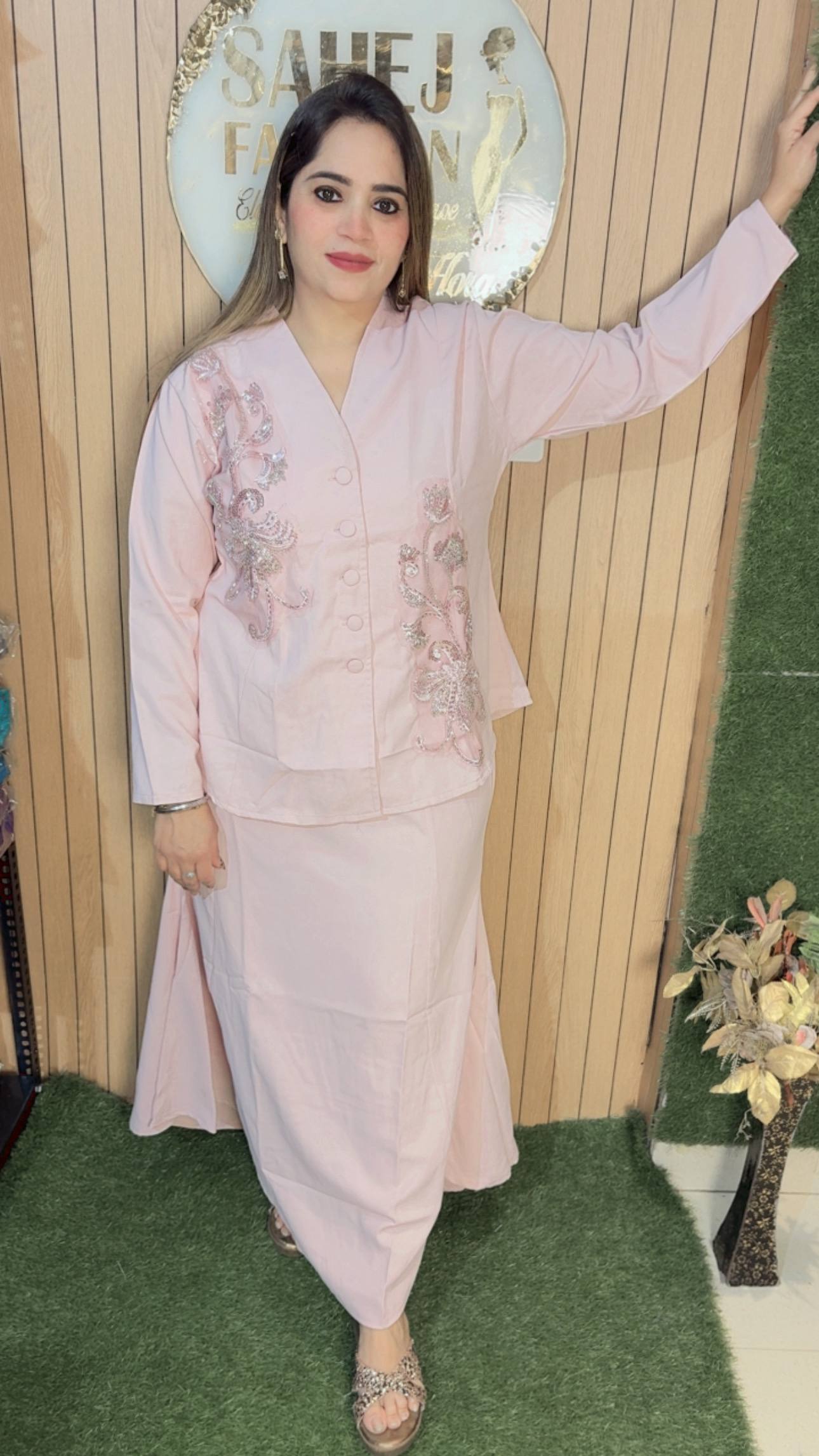 This outfit features a classy and contemporary ensemble that blends elegance with subtle detailing. The top is designed in a smart, structured silhouette with a V-neckline and front button closure, giving it a polished and sophisticated look. The highlight of the piece is the intricate metallic embroidery on both sides, adding a touch of shimmer and artistic flair without overpowering the simplicity of the outfit. The full sleeves enhance its refined appeal, making it suitable for both casual chic and semi-formal occasions.Paired with it is a long, flowy black skirt that falls gracefully, offering comfort along with a sleek, elongated look. The minimalistic design of the skirt perfectly balances the embellished top, creating a harmonious outfit.Styled with subtle accessories and embellished flats, this look is perfect for modern women who love understated elegance with a hint of glam.