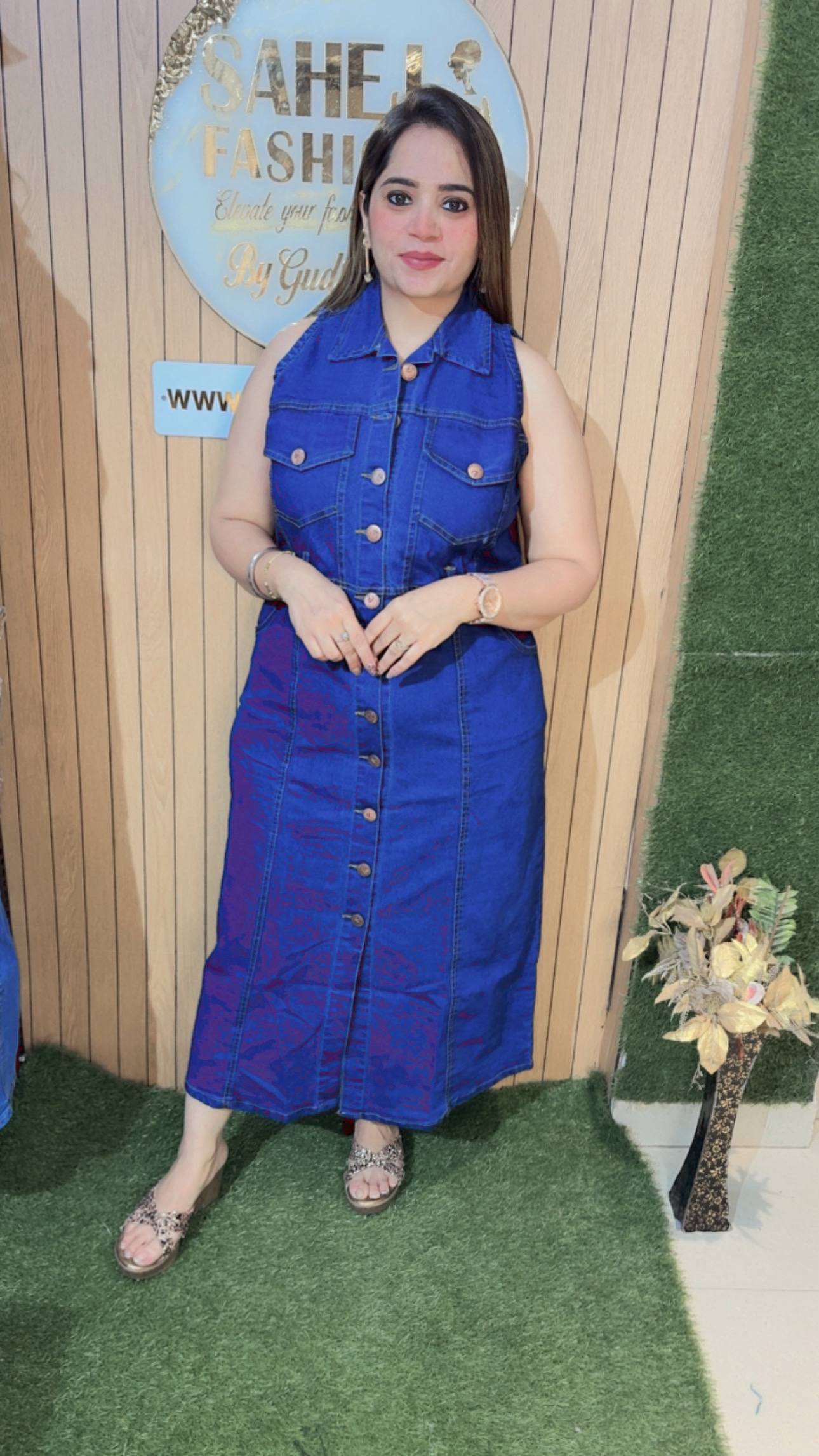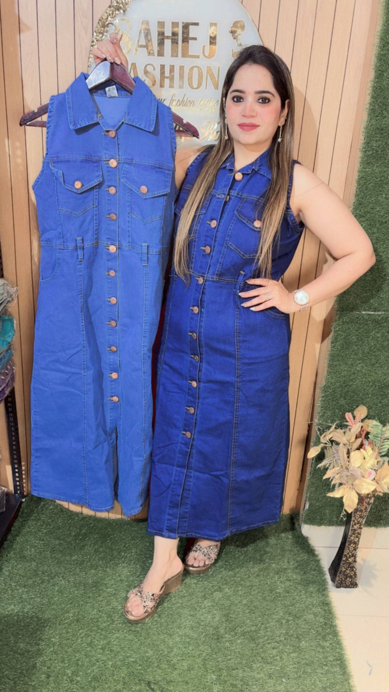 This outfit showcases a trendy and timeless denim look, perfect for effortless everyday styling.The dress is crafted in rich blue denim, featuring a sleeveless design with a smart collared neckline that adds a structured and modern touch. The front button-down detailing with metallic buttons enhances its classic appeal while making it easy to wear. It also includes flap pockets on the chest and subtle stitch detailing throughout, giving it a stylish, utility-inspired vibe.The midi-length silhouette offers a flattering and comfortable fit, making it suitable for all-day wear. The structured yet soft denim fabric ensures durability while maintaining a chic look.This versatile piece can be styled casually with flats for a relaxed day out or dressed up with accessories for a more polished appearance—making it a must-have staple for a contemporary wardrobe.