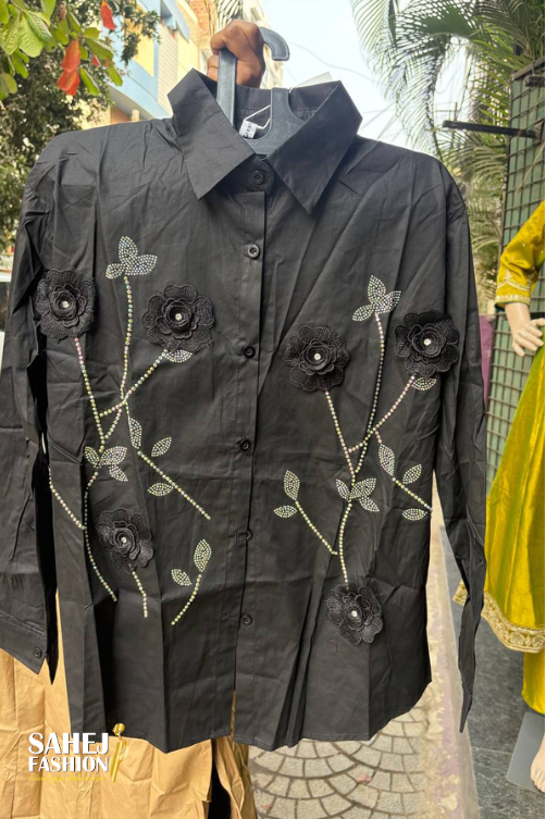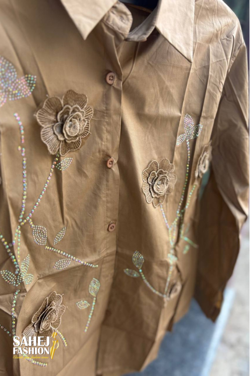 This stylish shirt-style top features a classic collared neckline with a full front button placket, offering a smart and versatile silhouette. Crafted in a smooth, structured fabric, the top is elevated with elegant floral embroidery across the front, beautifully accented with pearl and bead detailing that adds subtle sparkle and texture.The design showcases delicate vine and leaf motifs paired with 3D floral appliqué, creating a refined and feminine look. It comes with full-length sleeves that can be rolled up for a relaxed style, making it suitable for both casual and semi-formal wear.Available in rich and neutral tones, this top pairs effortlessly with trousers, jeans, or skirts—perfect for office wear, casual outings, or smart day events. A timeless piece that blends classic tailoring with decorative craftsmanship.